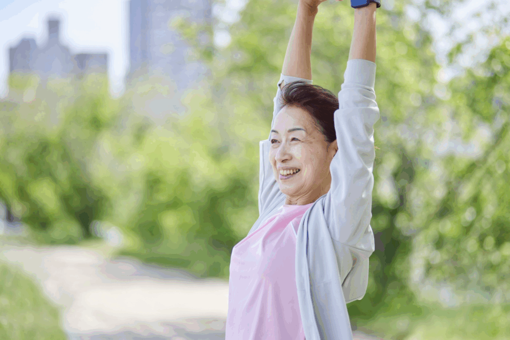 - 肩甲骨まわし:両肩に手を置き、肘で大きく円を描くように前回し・後ろ回しをそれぞれ10回ずつ行います。